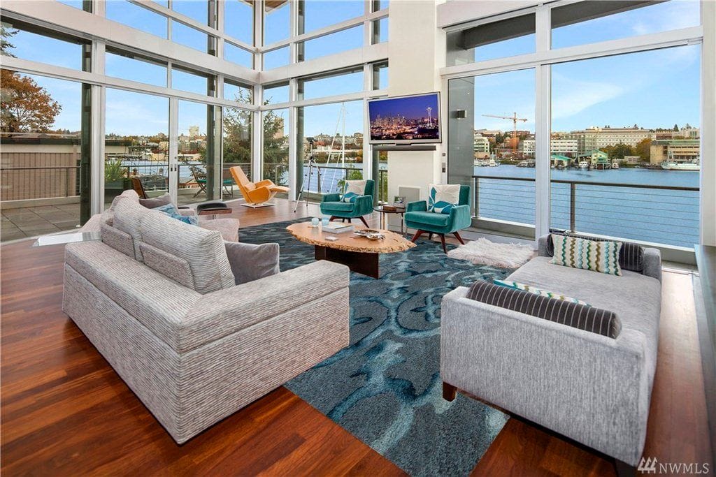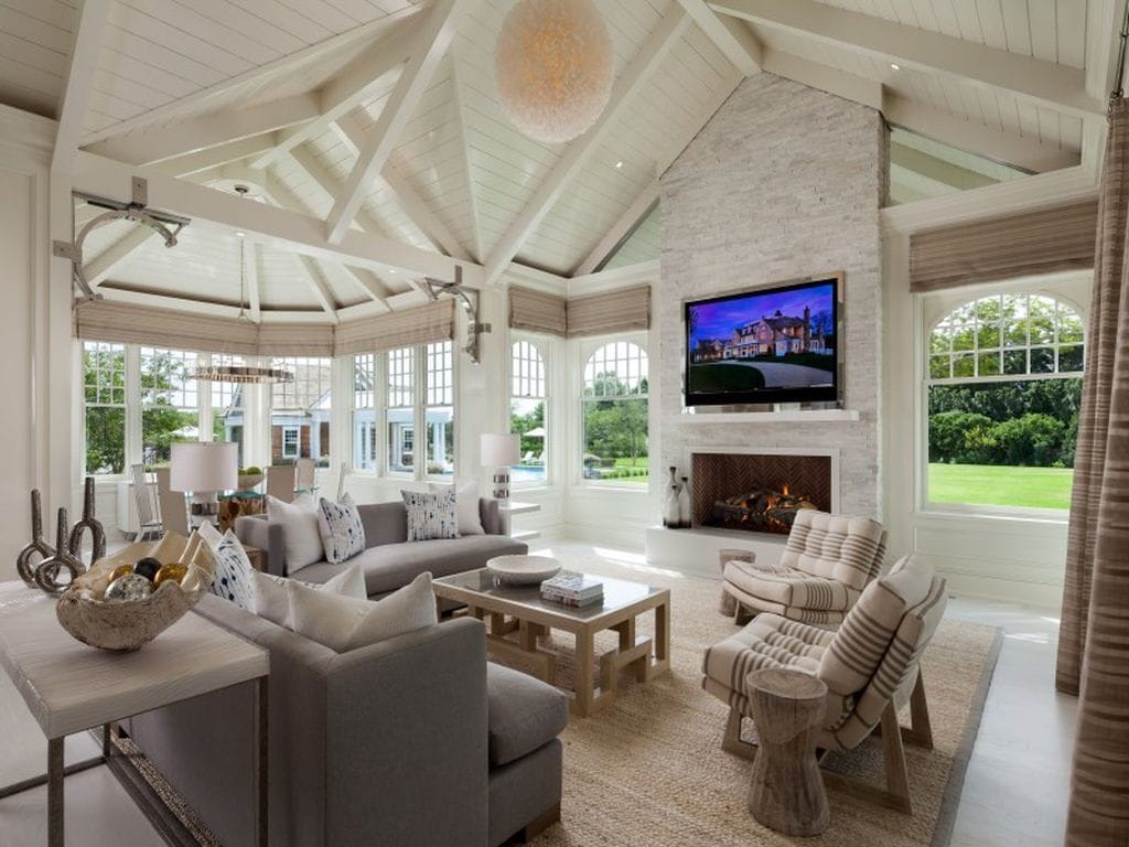 The room pictured above is a captivating mansion living room viewing the blue waters outside. The wall-mounted TV takes the room to the next level.
