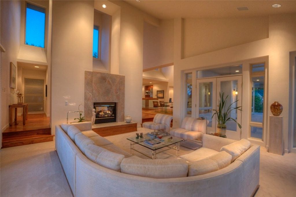 This mansion sitting room features a cathedral ceiling. It exudes a feeling of luxury in no time. The windows allow the sunlight to shine.