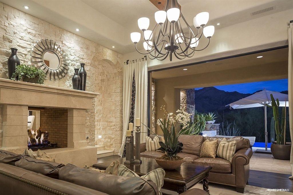 Polished concrete, stone fireplace wall, and limestone floor stamp a rustic vibe. The wrought iron chandeliers lend the living room the old, classy touch.