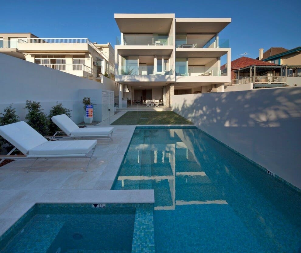 Not all suburb dwellings have a narrow courtyard. In the broader backyard, providing a lawn side by side with a swimming pool is the best option for chilling out.