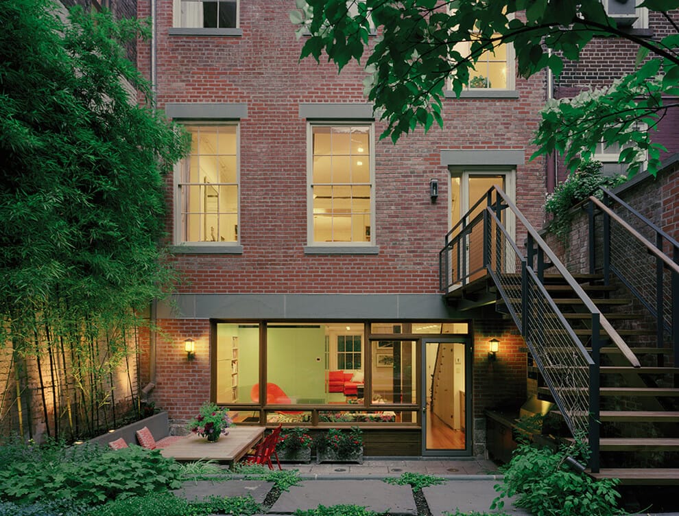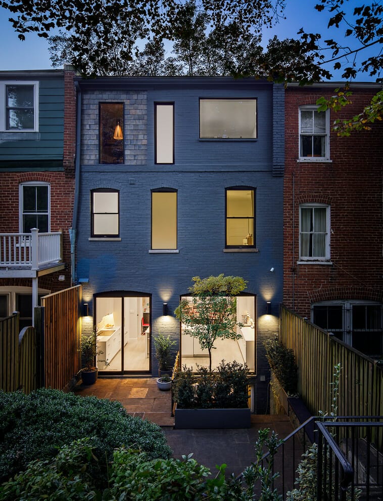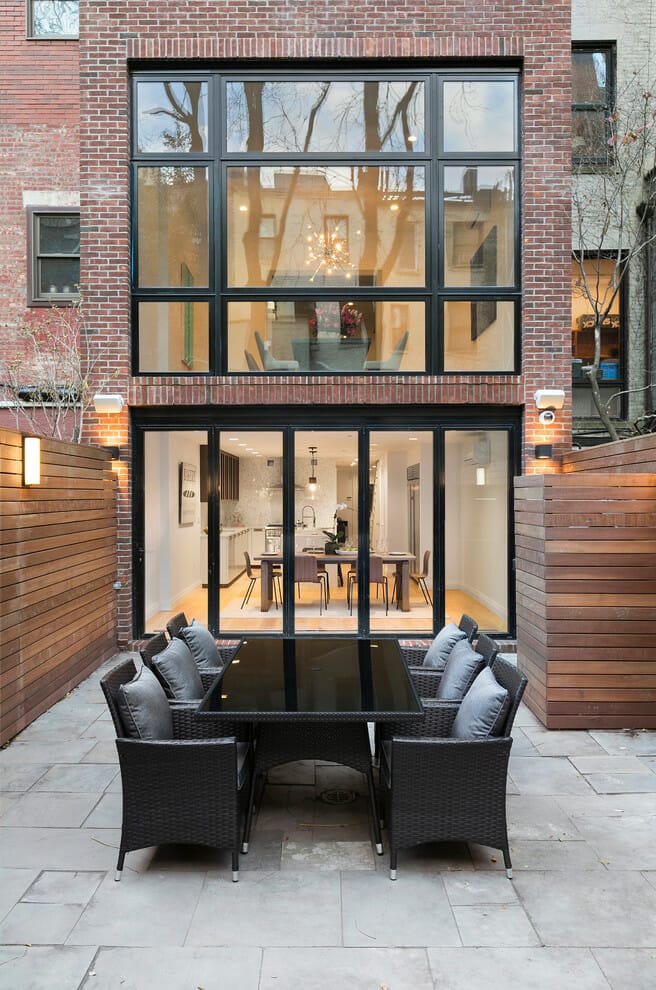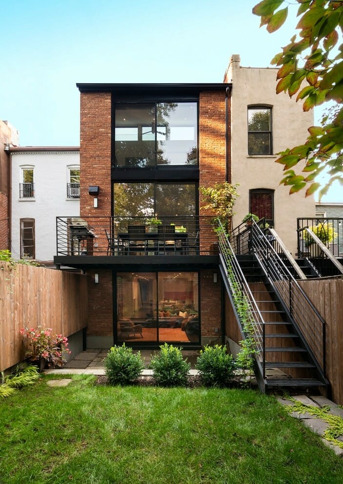 23. Modern Townhouse Backyard Ideas with Reflective Glass Windows