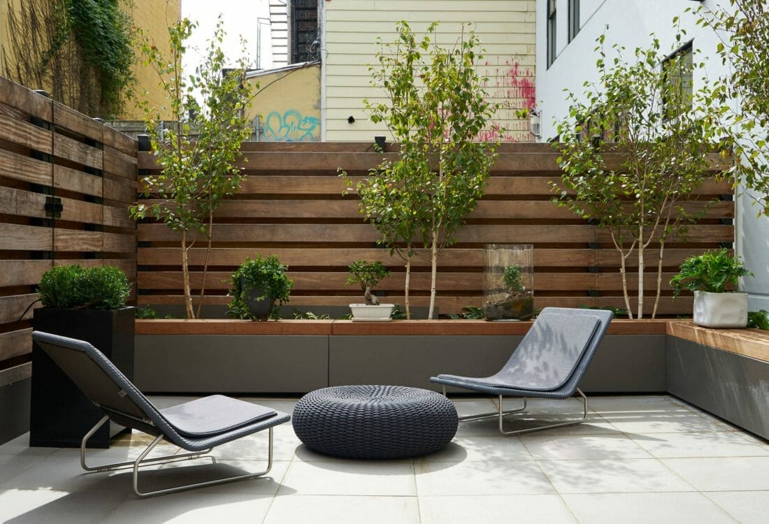 9. Townhouse Backyard Privacy Ideas with White Fence and Boscage