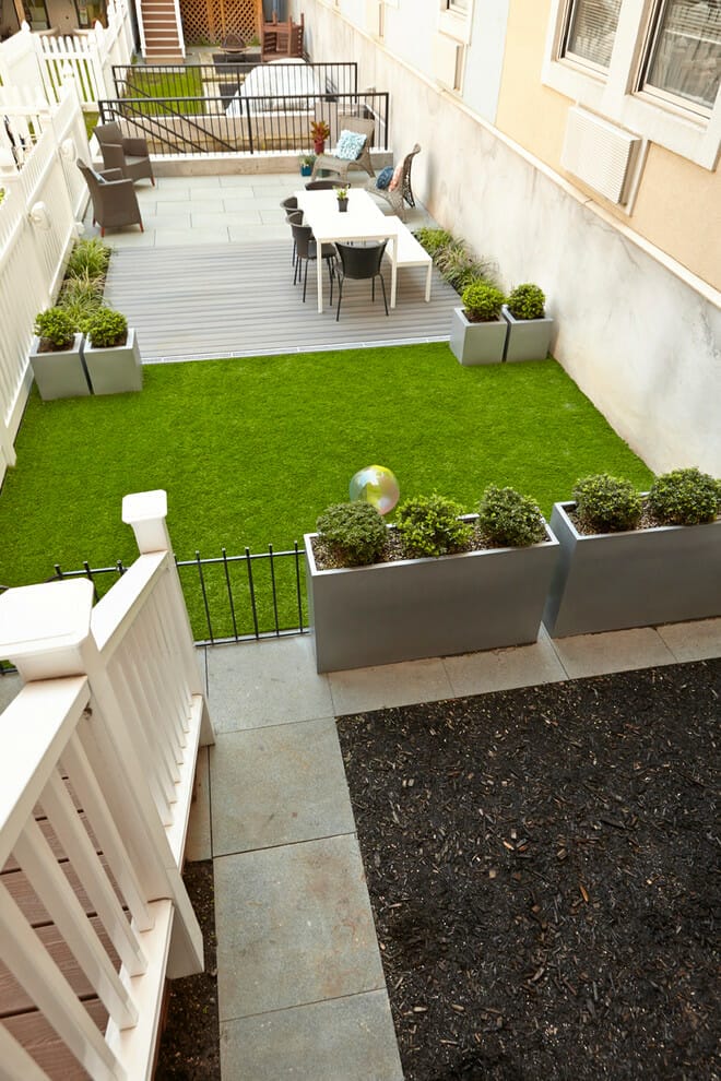 The townhouse backyard ideas with lawns may be a little challenging to maintain. It said so because the grounds require regular trimming to keep the grass attractive to look at.