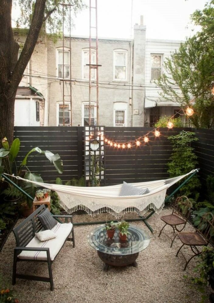 Sprucing up a small courtyard can be quickly achieved by simply hanging string light and hammock there.