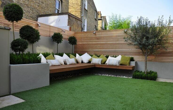 17. Classy Townhouse Backyard Ideas with Floating Bench and Cushions