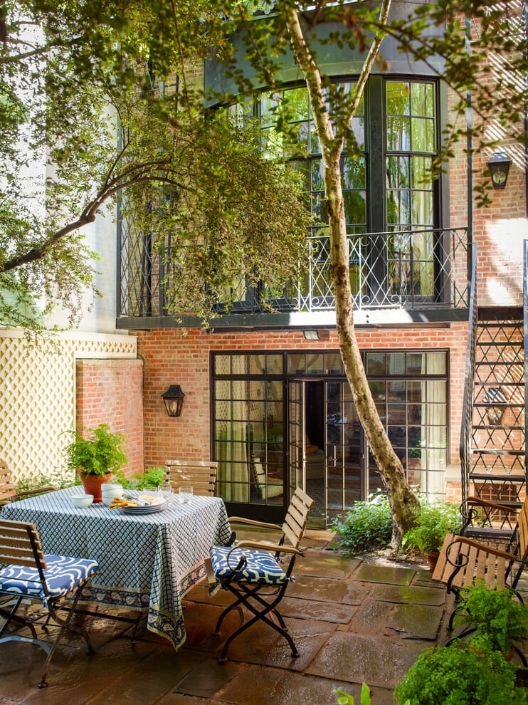 20. Refreshing Townhouse Backyard Ideas with Outdoor Dining Space Under the Trees
