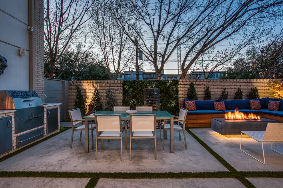 Using only concrete pavers as flooring on your patio will make your backyard look less aesthetic. Thus, add green grass between the paver blocks to create a refreshing line.