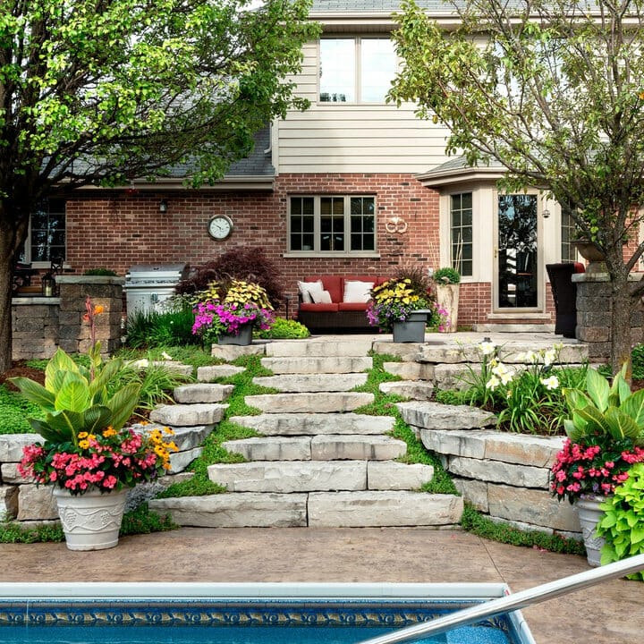 You will want to add a contemporary style without discounting the natural look. Therefore, laying uneven bluestone would be a terrific idea. Do not forget to install railing for peace of mind.