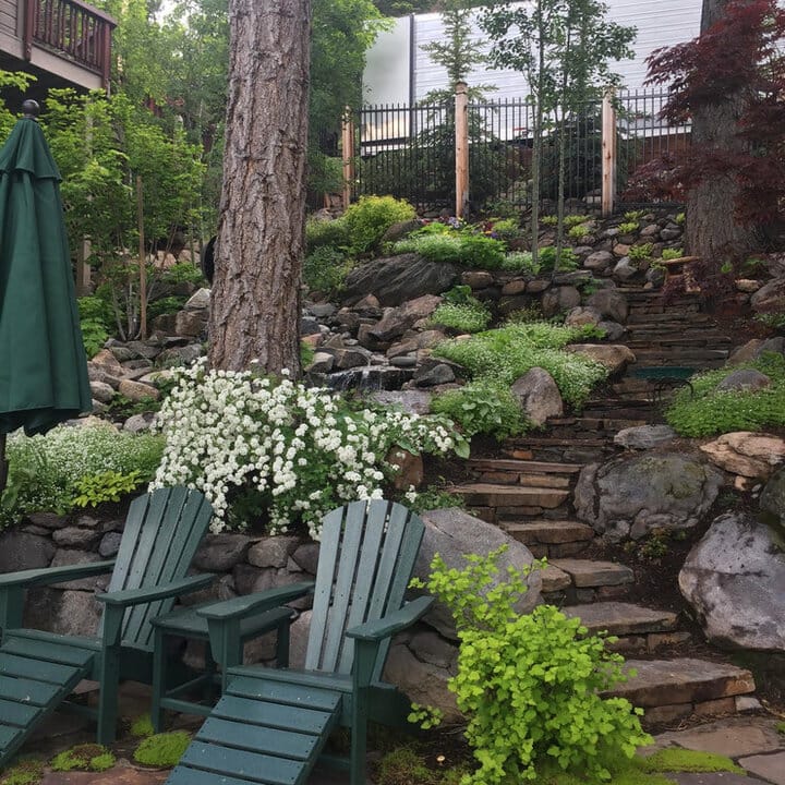 This backyard embraces rustic charm through large, irregular stones as the retaining walls. Instead of installing rocks for the steps, you can try wood. This way, you can incorporate a bit of a contemporary look.