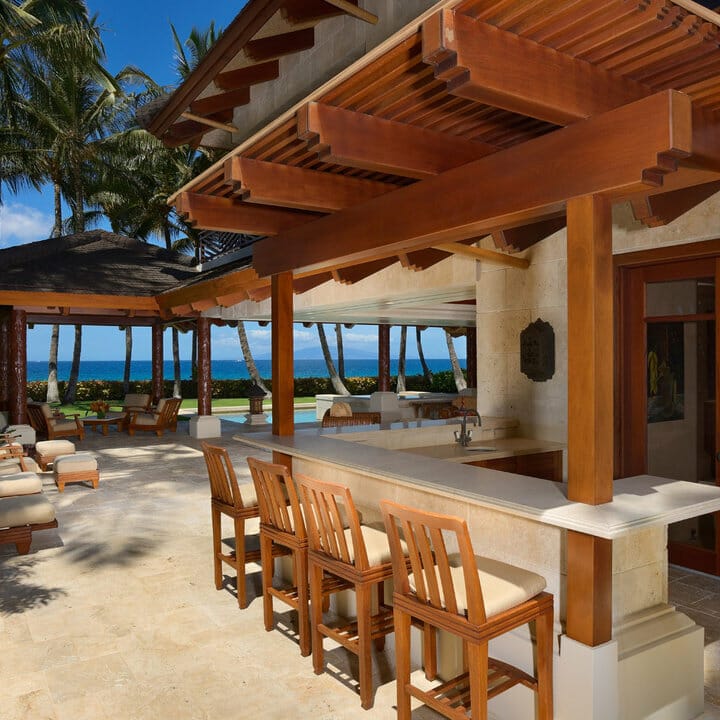 Speaking of outside bar ideas, try this design. The cream limestone island and floor tiles inspire tranquility. In addition to carving a relaxing vibe, they accentuate the medium-toned wooden furniture items, beams, and posts.