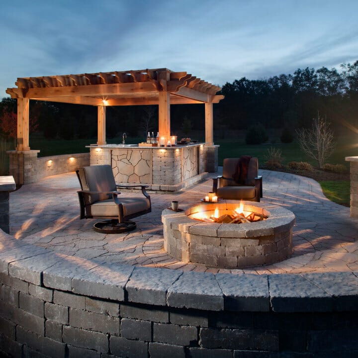Because of the fire pit, light fixtures, and candles, the bar feels extra cozy. Lastly, upholstered gray armchairs offer comfort while unifying the outdoor space.