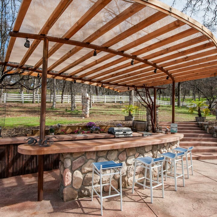This outdoor bar is drool-worthy. The natural wooden island and panels imbue it with Mother Nature’s raw beauty.
