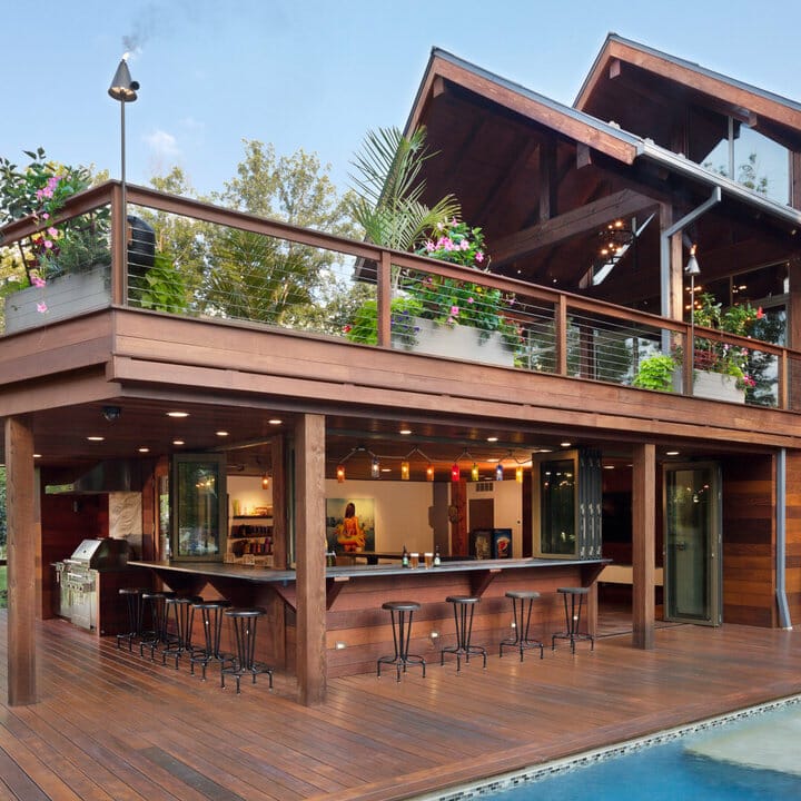 Speaking of outdoor bar ideas for decks, this design is worth trying. Here, the bar becomes a part of an expansive backyard. Furthermore, the wooden flooring, island, and posts produce a homey look. They balance out silver and black metal accents, too.