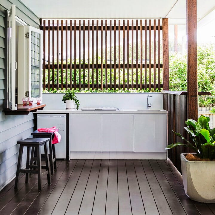 Petite backyard? No problem. Just implement this outdoor bar idea. The homeowner equipped the space with the bright white backsplash, counter, and handleless cabinets. Due to them, the bar feels more spacious.