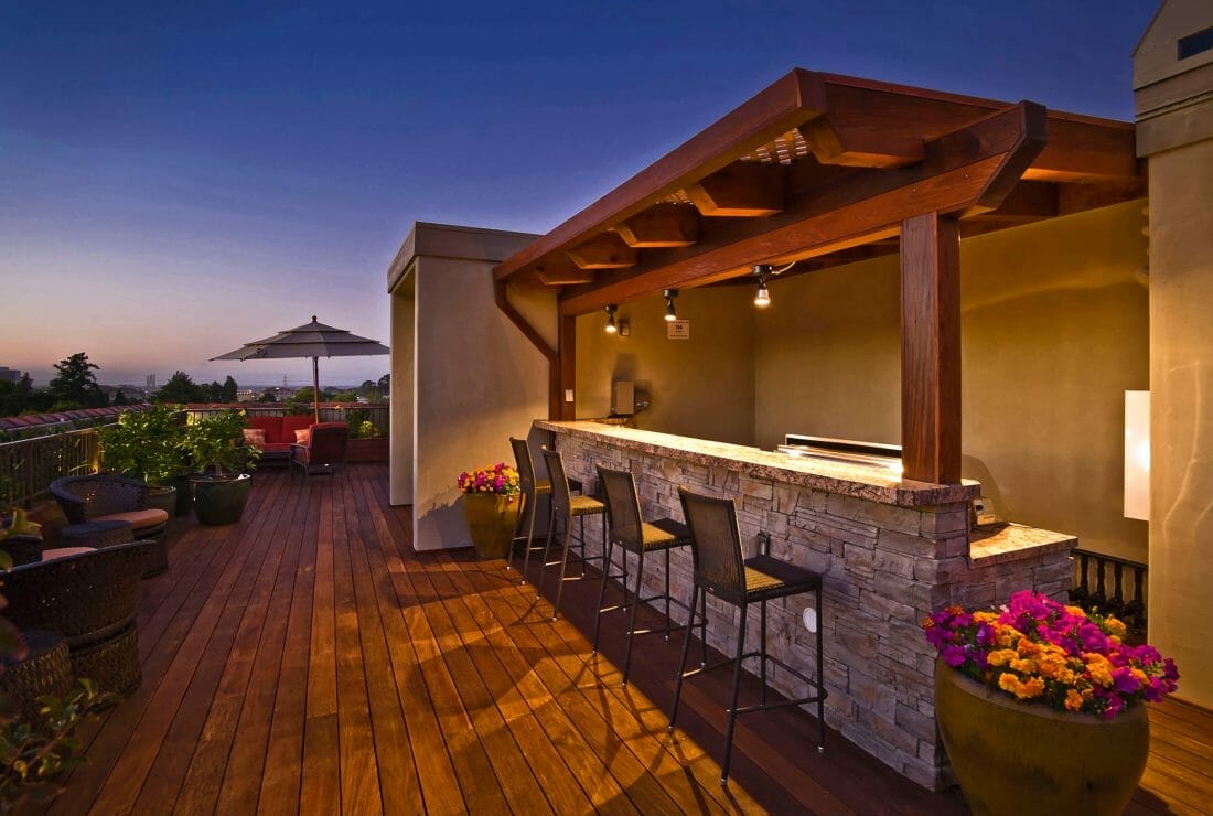 The pergola roof and patio umbrella shade the bar from the scorching sun. Because of stunning plants and flowers, the whole deck doesn’t appear lackluster.