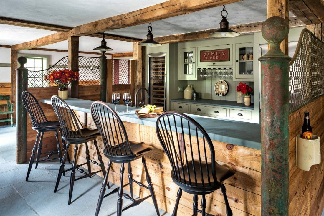 Reclaimed wood beams and weathered metal posts embrace a rustic appeal. Furthermore, the cabinetry, black stools, and pendants nod to the traditional style. Lastly, the sign and cream vases generate a retro flair.