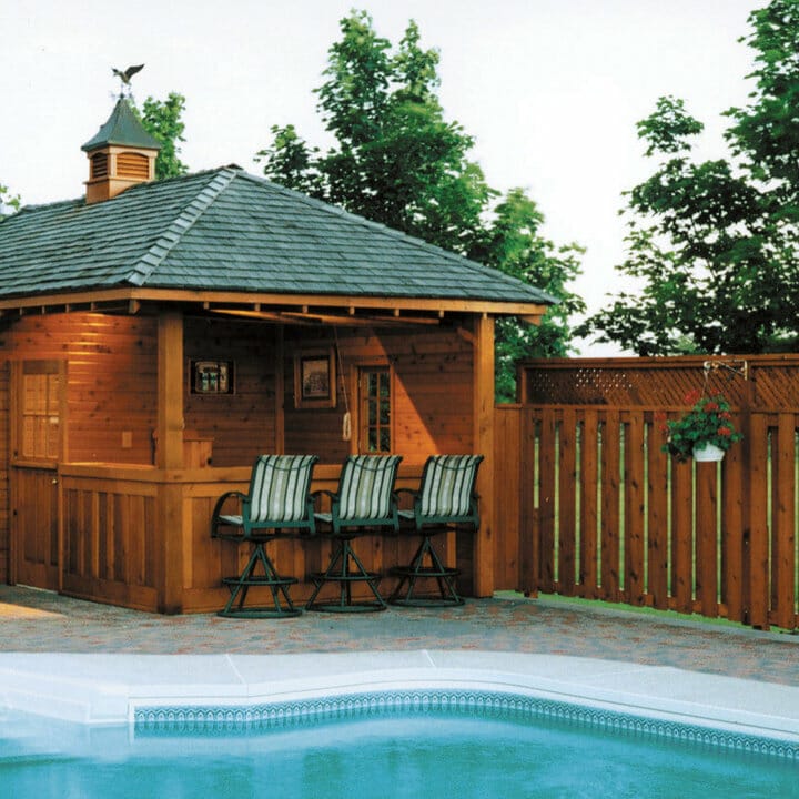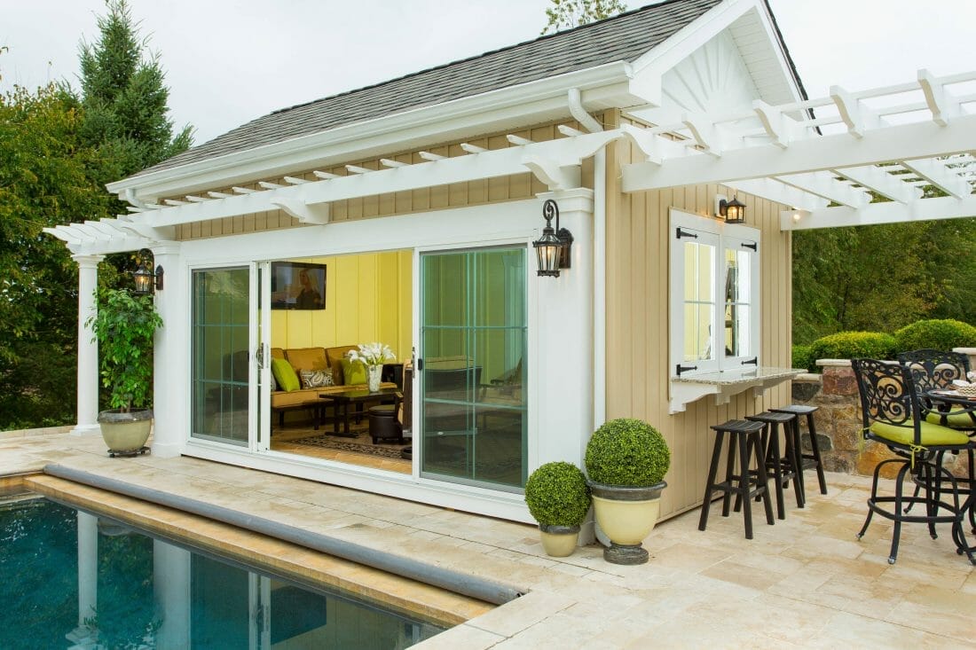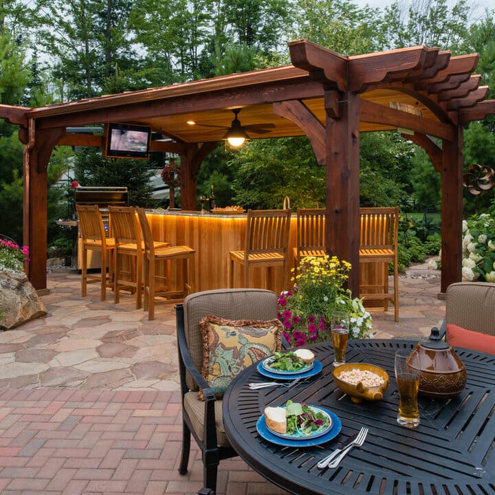 The wooden pergola roof shades the outside bar from the sun while evoking warmth. In addition, it allows the building to become a focal point of the yard.