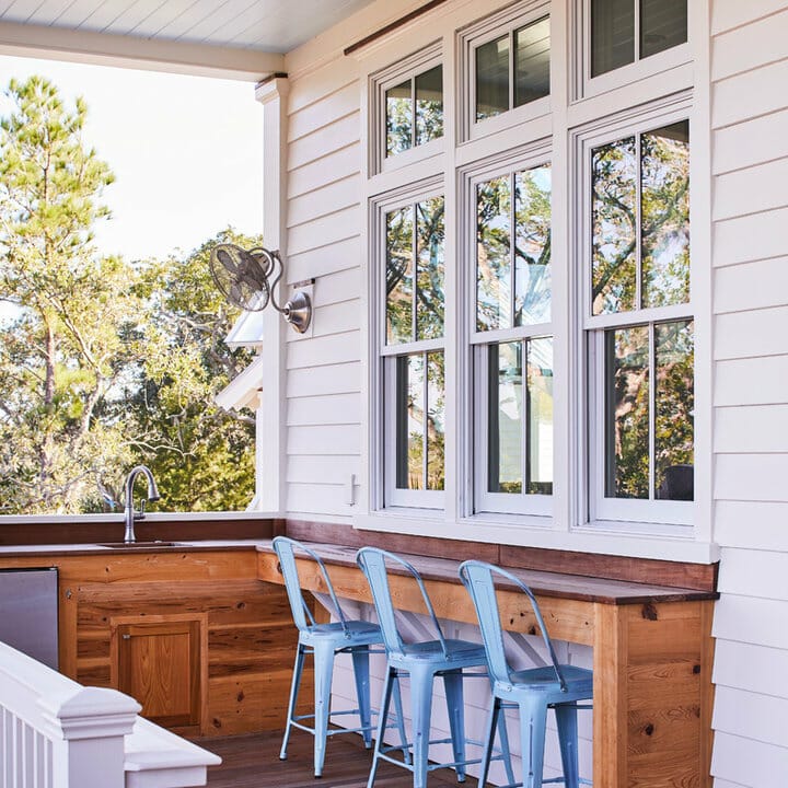 Short on space? Borrow this outdoor bar idea. The stark white railing, siding, and trim details evoke serious airiness. Because of them, the hangout spot seems larger.