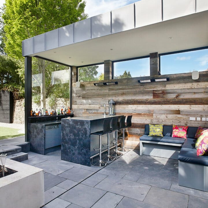Talking about modern outdoor bar ideas, steal this design. Sharp edges and strict lines make the backyard bar seem very stylish.