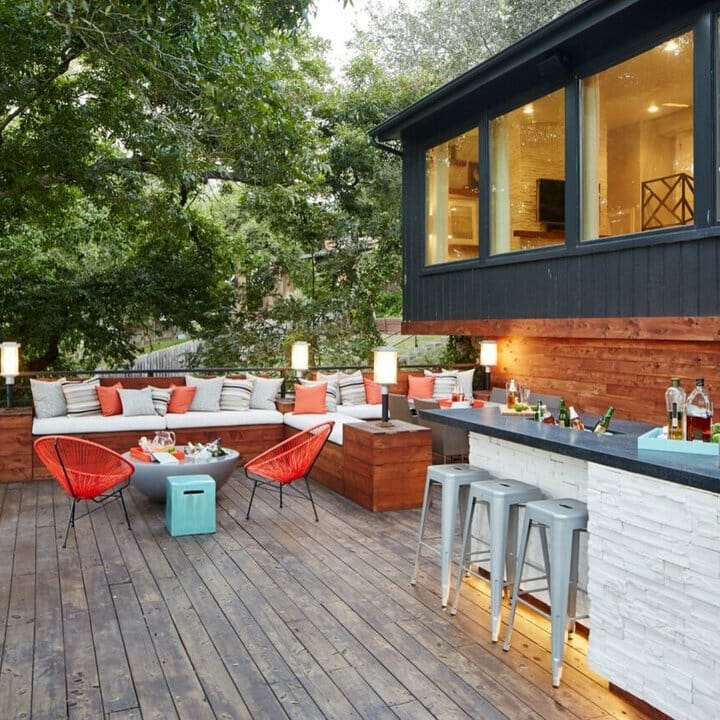 Because of unpainted wooden accents, the outside bar seems inviting. Moreover, black metal units embrace an industrial flavor, while bursts of orange perk the yard up.