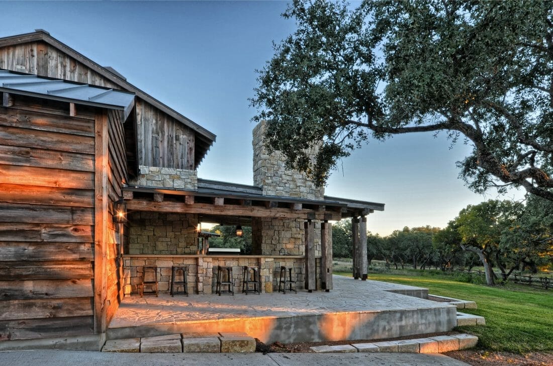 The rugged stone floor, exterior walls, and columns develop a natural ambiance. Moreover, due to them, the outdoor bar doesn’t feel out of place.
