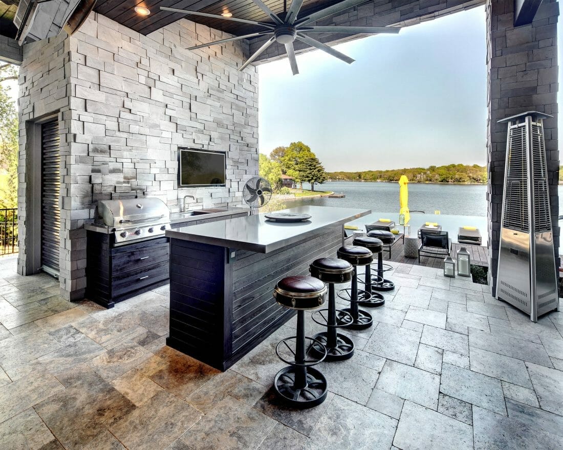 Honed stone tiles lend the outside bar a visual appeal and a rustic flavor. Furthermore, the gray stone bricks bring dimension to the outdoor space.