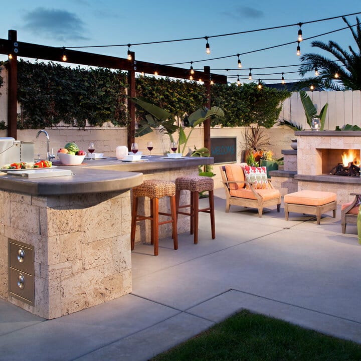 The concrete counter and tiles embrace an urban ambiance. Overhead are string lights with black covers. Moreover, they illuminate the outdoor bar.