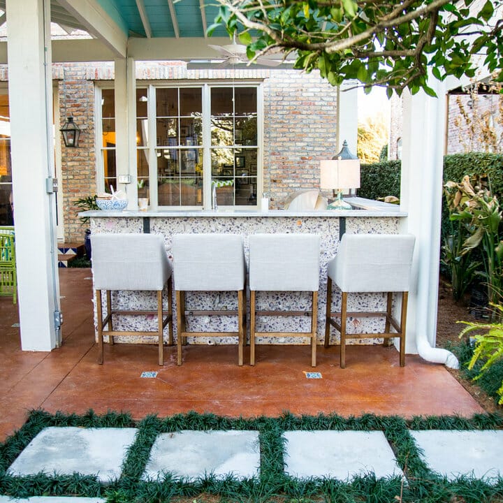 Need outside bar ideas? Steal this design. The whitewashed stone island and metallic gray stools infuse an industrial flavor.