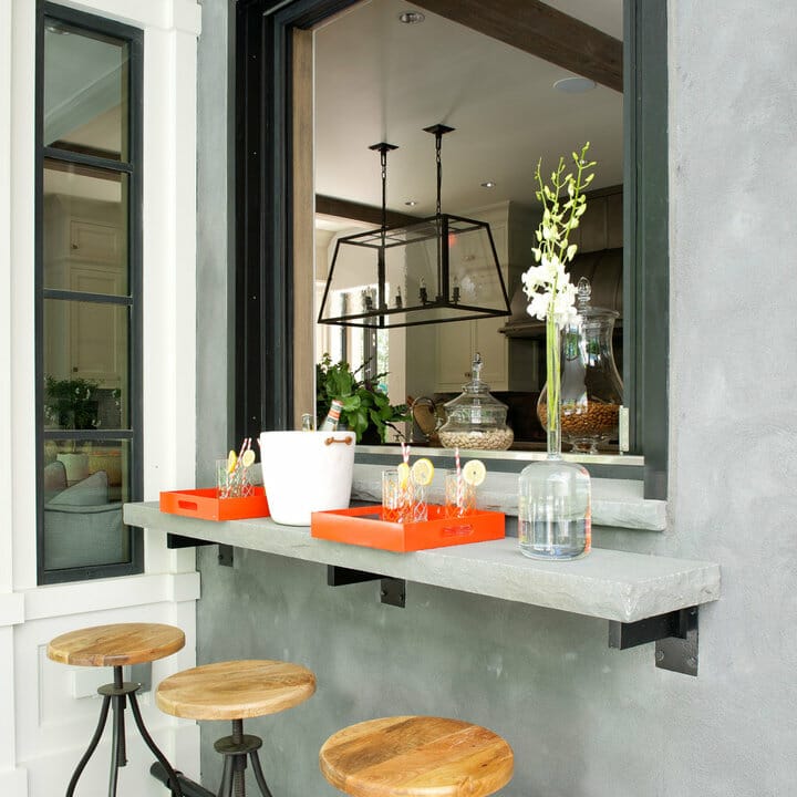 With numerous outside bar ideas, your choices are limitless. As you see, the marble counter extends beyond the black-framed window. Apart from appearing stylish, it injects an ambiance of luxury.