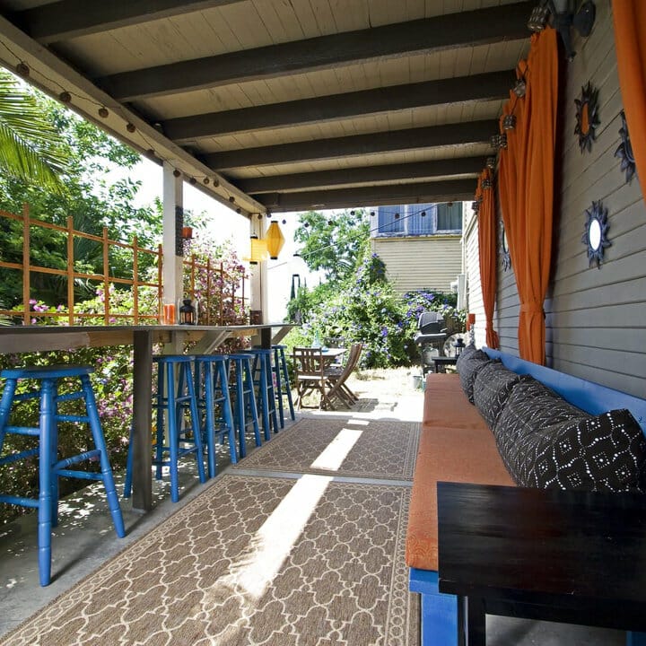 The blue bench, blooms, and stools invigorate the outside bar. Furthermore, throw pillows and rugs generate Moroccan vibes. Lastly, Chinese lanterns, globe lights, and sunburst mirrors send out an eclectic feel.