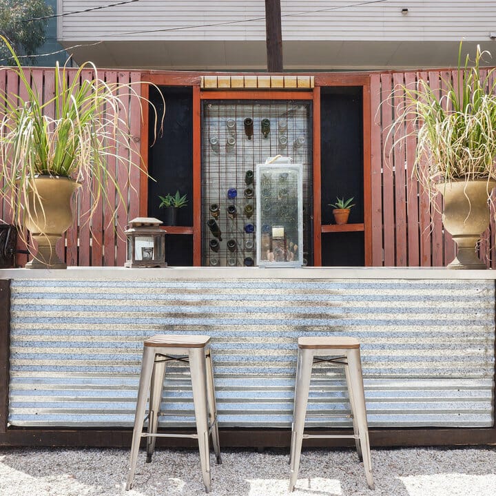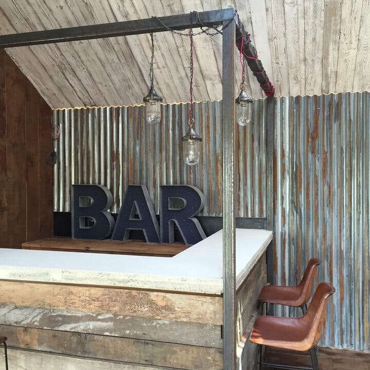 This bar employs a corrugated galvanized metal panel and distressed wooden accents. Furthermore, they inject the outdoor bar with a rustic appeal.