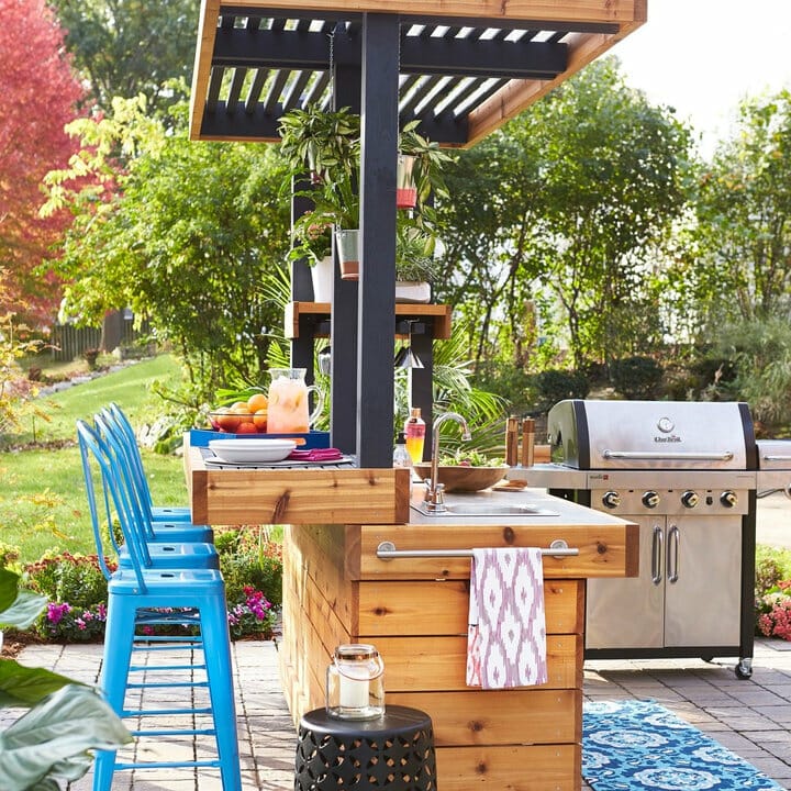Due to the sink, the spot becomes an outdoor wet bar. Furthermore, colorful blooms and blue chairs jazz the outdoors up.