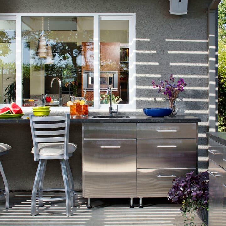 Windows connect the kitchen with the outside bar. Moreover, the silver sink and cabinets give the outdoor area some glamorous shine.