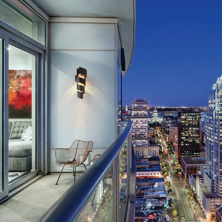 Lastly, the black spiral wall sconce looks impressive against the light gray wall. It illuminates the apartment balcony while evoking a modern feel.