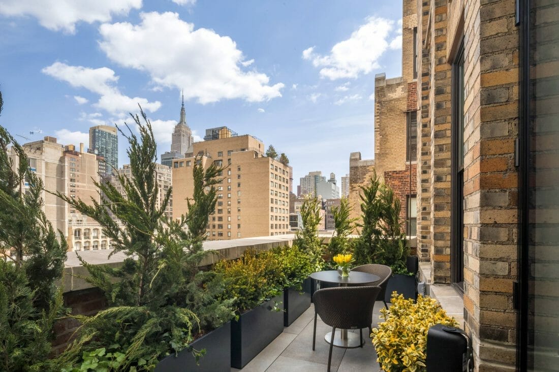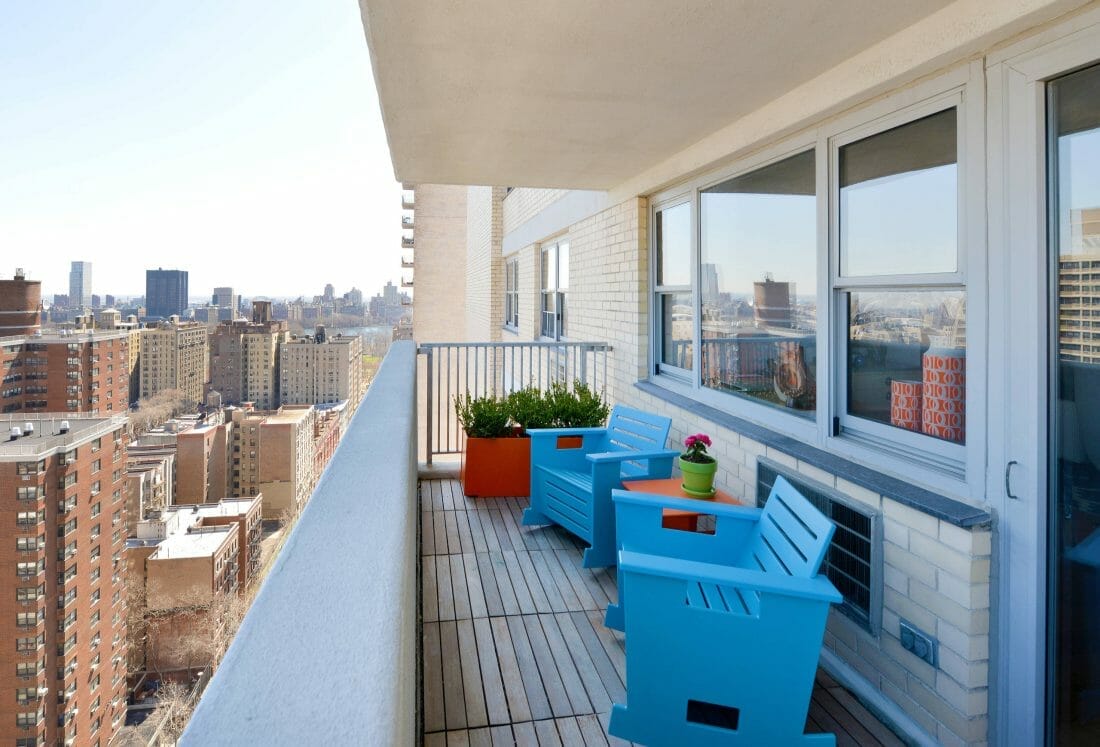 Talking about apartment balcony ideas, consider adding just a few furniture pieces. By doing so, your pint-sized outdoor area won’t seem cramped.
