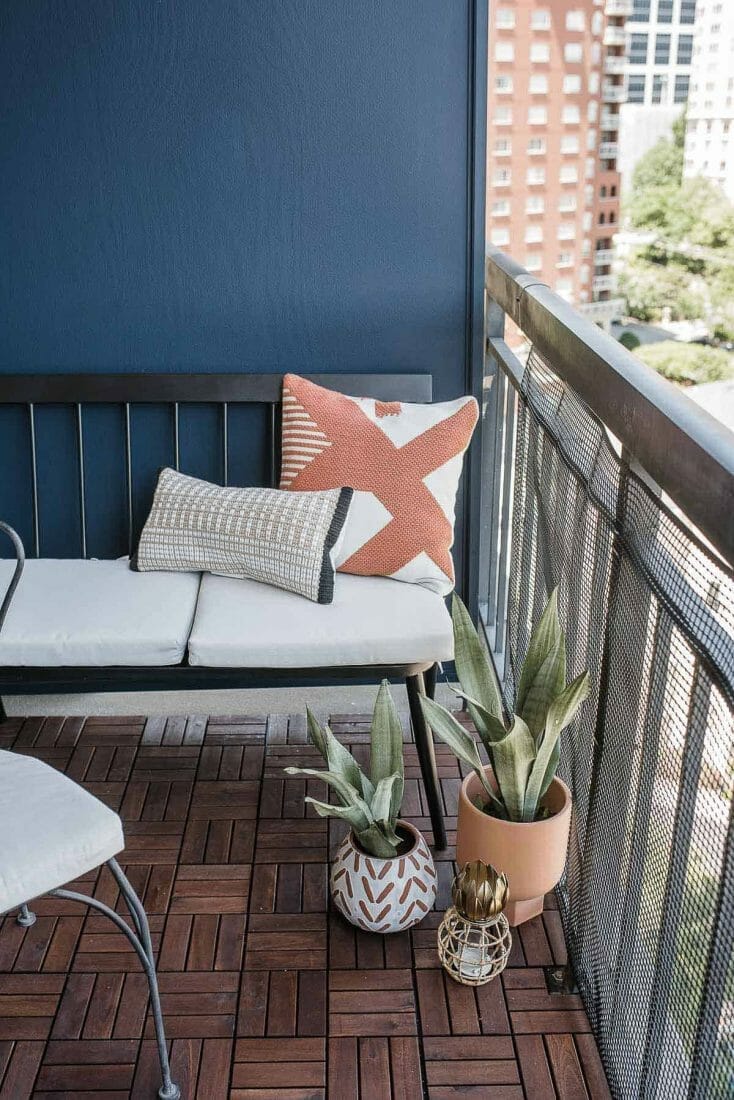 Here, the black sofa and navy wall give the apartment balcony a dramatic statement. In addition, crisp white seat cushions make the outdoor area brighter.