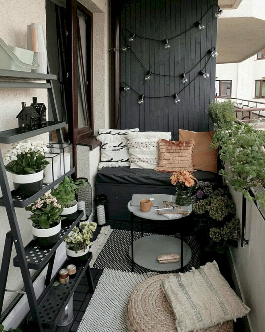 The textured fence and walls give the apartment balcony character. Due to the black backdrop, adorable throw pillows become visible.