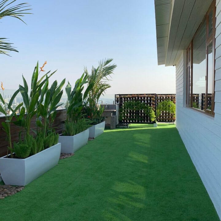 Here, the balcony garden features minimalist planters with dwarf shrubs, palm trees, and birds of paradise. Also, they lend the outdoor area vivid accents.