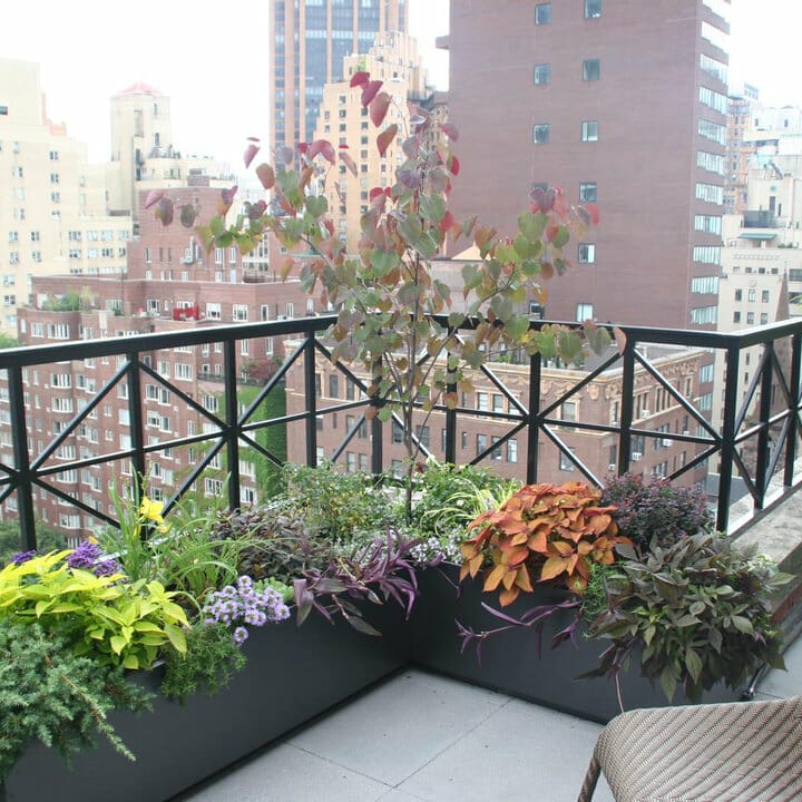This balcony garden overlooks the cityscape. The geometric metal railings and sleek raised beds fit the modern apartment-style perfectly. Because of them, the outdoor space receives instant drama.