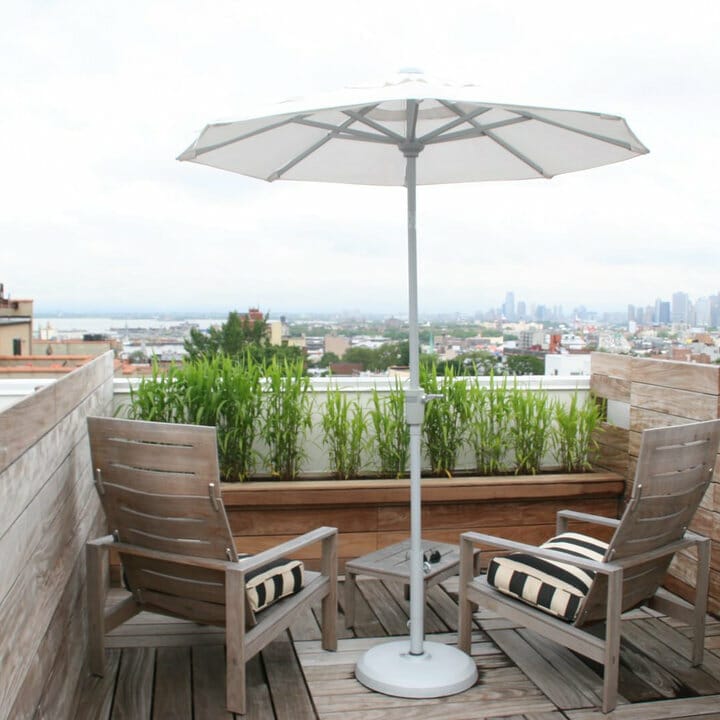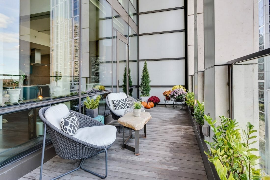 If your balcony garden is narrow, don’t try complicating the decor. This area only has a table and two gray chairs that face the cityscape.