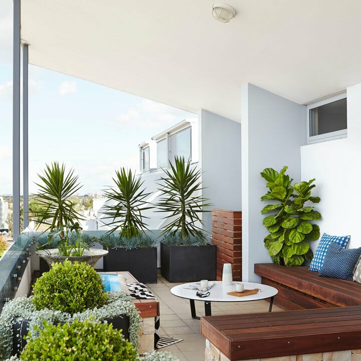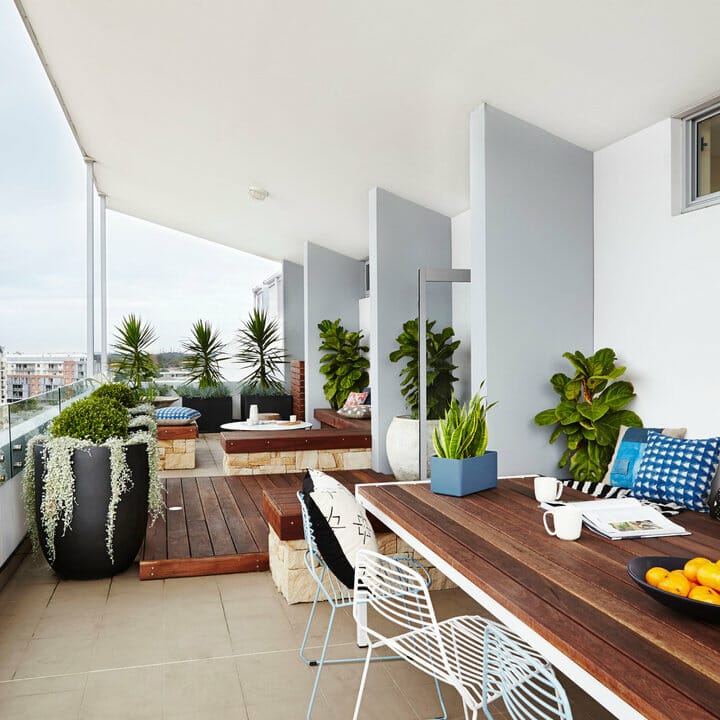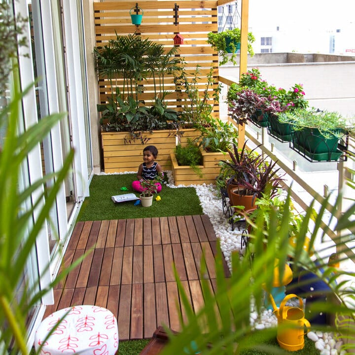 For sure, this is one of the balcony garden ideas to steal. Here, teak furniture pieces and wrought-iron planters come in modular shapes. Also, they complement the modern apartment delightfully.