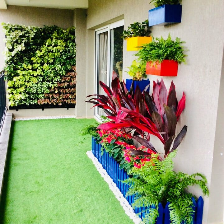 This balcony garden is an ideal space to relax as well as dine. Lastly, bursts of yellow and blue inspire happiness.