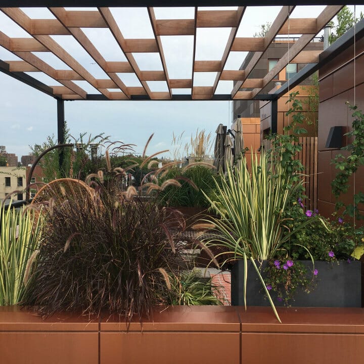 This balcony garden employs sleeks wooden details. Moreover, they appear on the pillars, trellis, and bench. In addition, those surfaces send out an inviting air.