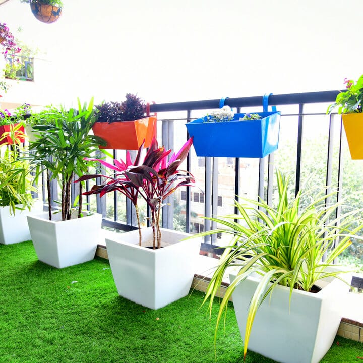 Plants enliven the balcony garden with splashes of purple, orange, yellow, green, and red. Due to them, the space doesn’t look blah anymore.