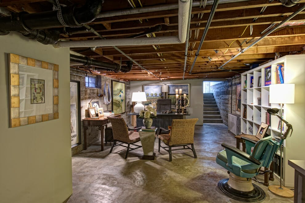 Create a warm and inviting atmosphere in your basement by exposing the ceiling beams and incorporating pieces of furniture that match the wood’s tones.