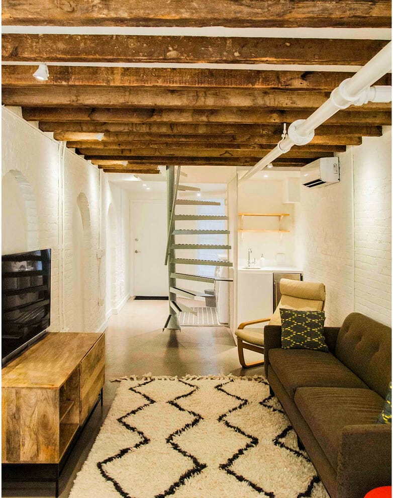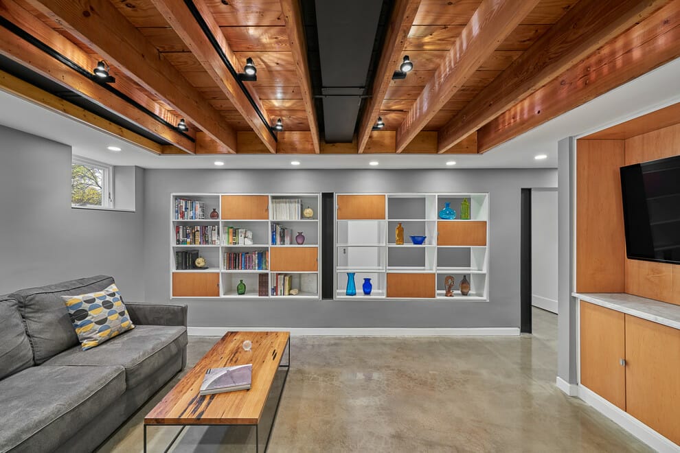 A low-height basement is not an issue thanks to the neatly exposed ceiling that prevents the room from feeling cramped.