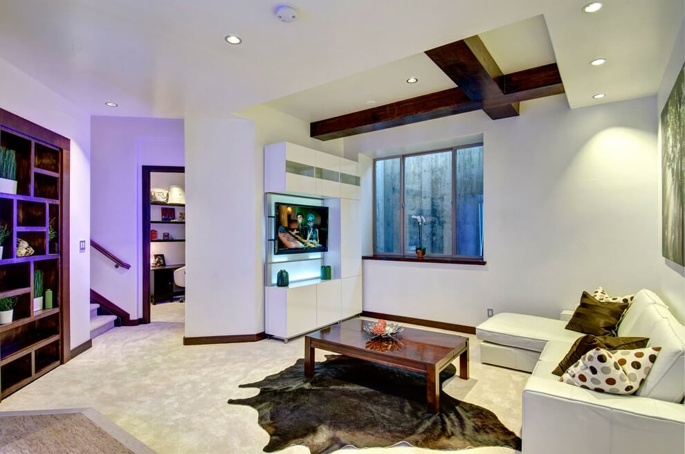 Keeping the ceiling in light shades helps keep this basement brighter. The big wooden beams are kept in their natural color to mirror the furniture underneath.