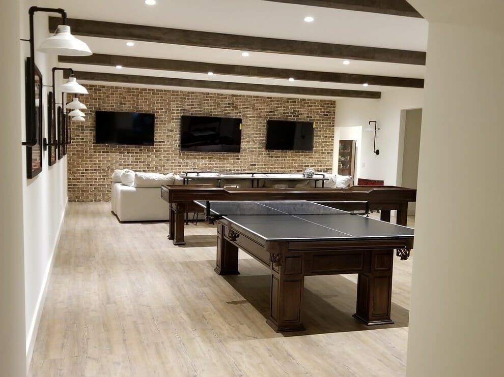 The large exposed beams on the ceiling become an eye-catching focal point of the basement, supporting the earthy palette shown by the walls and furniture pieces.