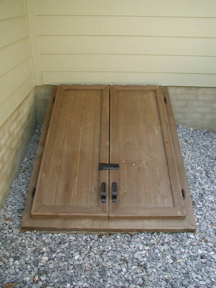 You only need to install a thick, sturdy wooden door for the entrance cover. Then, add a padlock slot and handles made of dark metal.