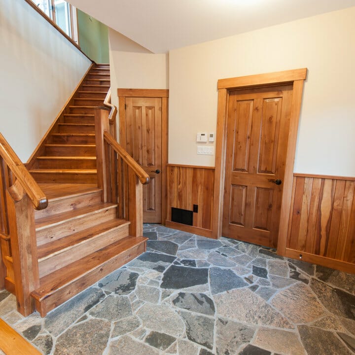 Not only by leaving the staircase in all wood, but you can also equip it with stone floors, wooden doors, and raw wainscoting to strengthen the rustic ambiance in your basement.